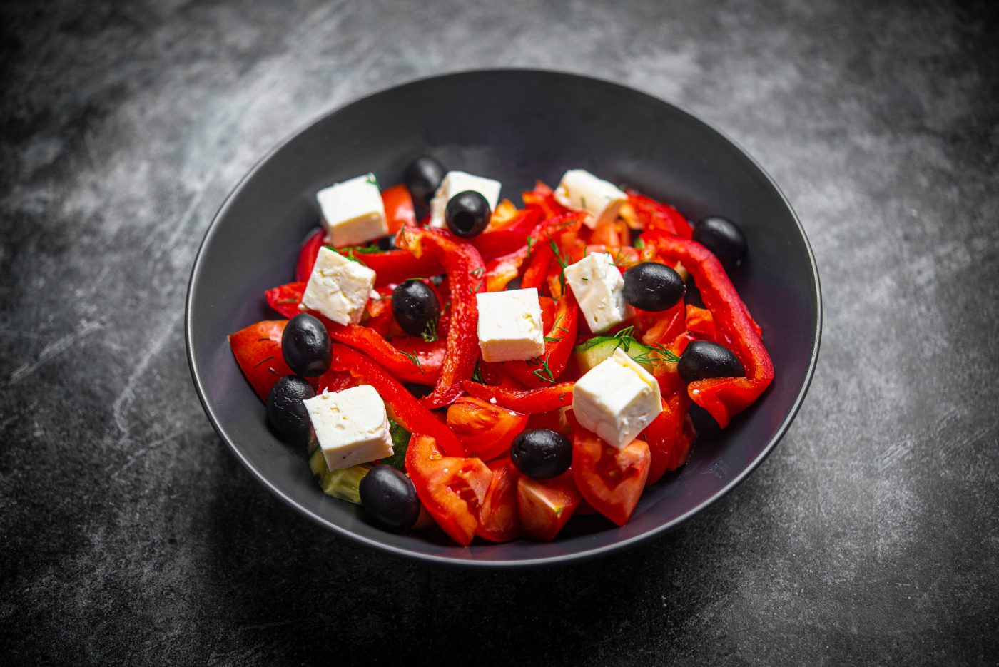 огурцы, помидоры, сыр фета, паприка, листья салата, оливки, зелень